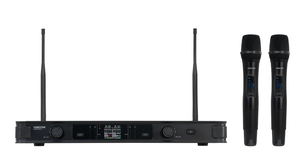 Fonestar SONAIR‑PRO‑2M – Bộ micro không dây cầm tay đôi (UHF 640–690 MHz), gồm 1 bộ thu và 2 micro.