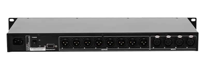 - Cấu hình cổng: 4 ngõ vào cân bằng (Balanced Inputs) và 8 ngõ ra cân bằng (Balanced Outputs).