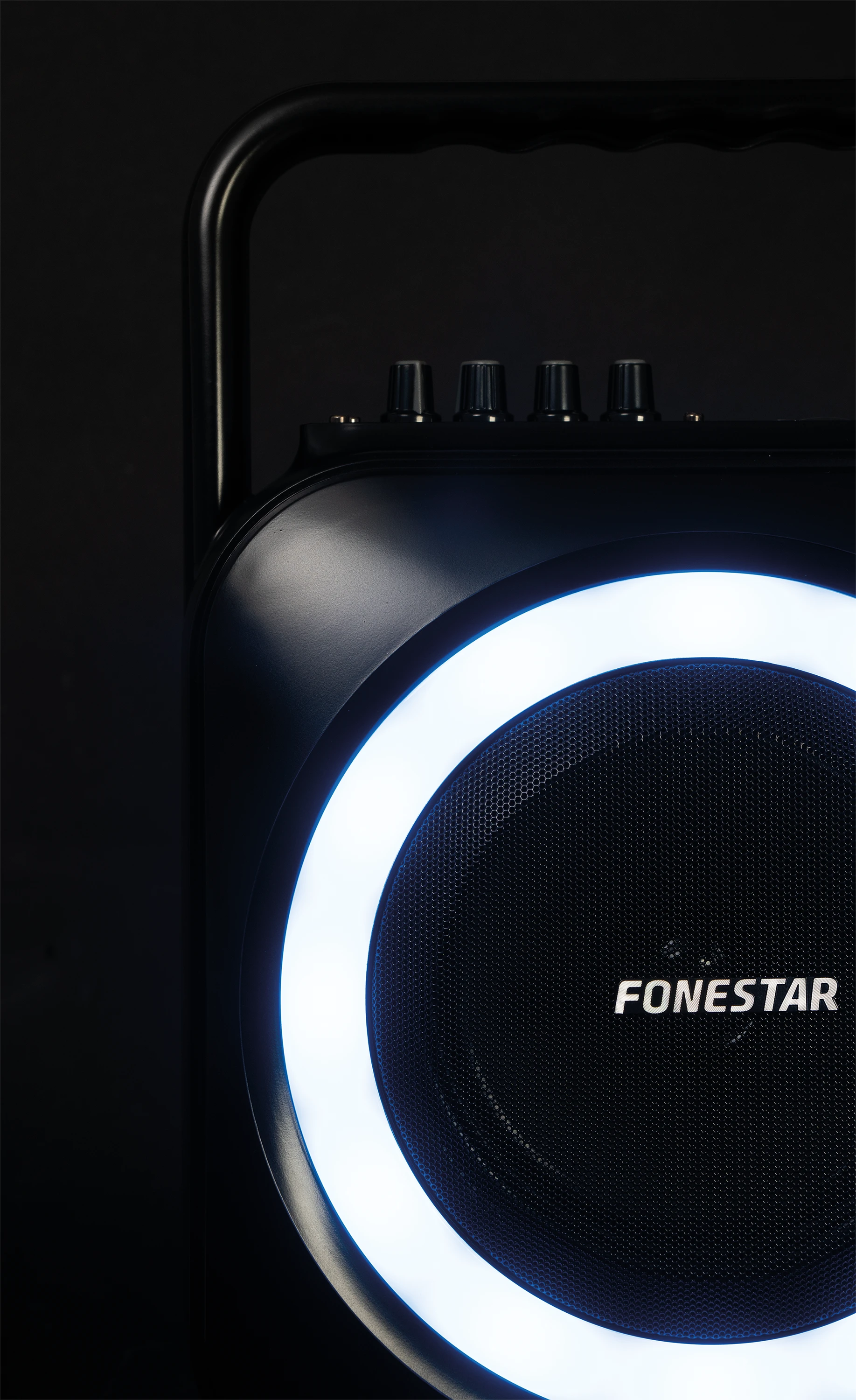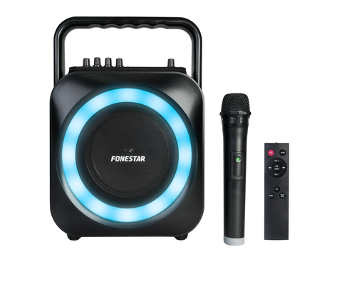 Fonestar BOX‑35LED – Loa di động karaoke, công suất 35 W RMS, kèm micro không dây VHF, đèn LED hiệu ứng, ghi âm micro.